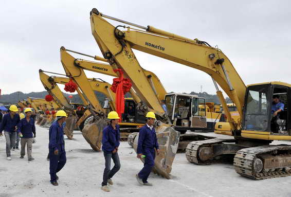 圖① 10月25日,幾名工人從廣州蘿崗中心城區(qū)保障性住房項目開工儀式現(xiàn)場的幾臺挖掘機旁走過。