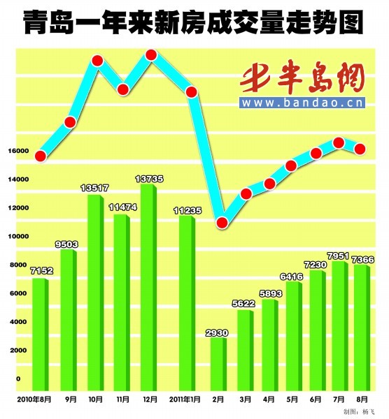 青島市房地產交易中心的統計數據顯示,8月份全市新建商品住宅共成交7366套,較7月份減少了585套,環比跌幅達7%。