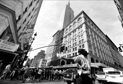 24日,一名警察在美國紐約帝國大廈附近指揮交通。新華社發