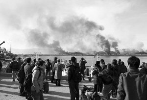 11月23日,人們觀望韓國西部延坪島上的滾滾硝煙。 新華社發