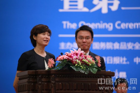食品安全宣傳周形象大使著名主持人敬一丹和張羽代表“全國食品安全宣傳周”標識征集活動主辦方宣布中標作品、作者。 攝影/記者 王維亮