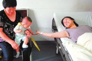 7月3日,躺在病床上的吳菊萍用右手握著7個月大兒子陳至軒的小手。新華社發